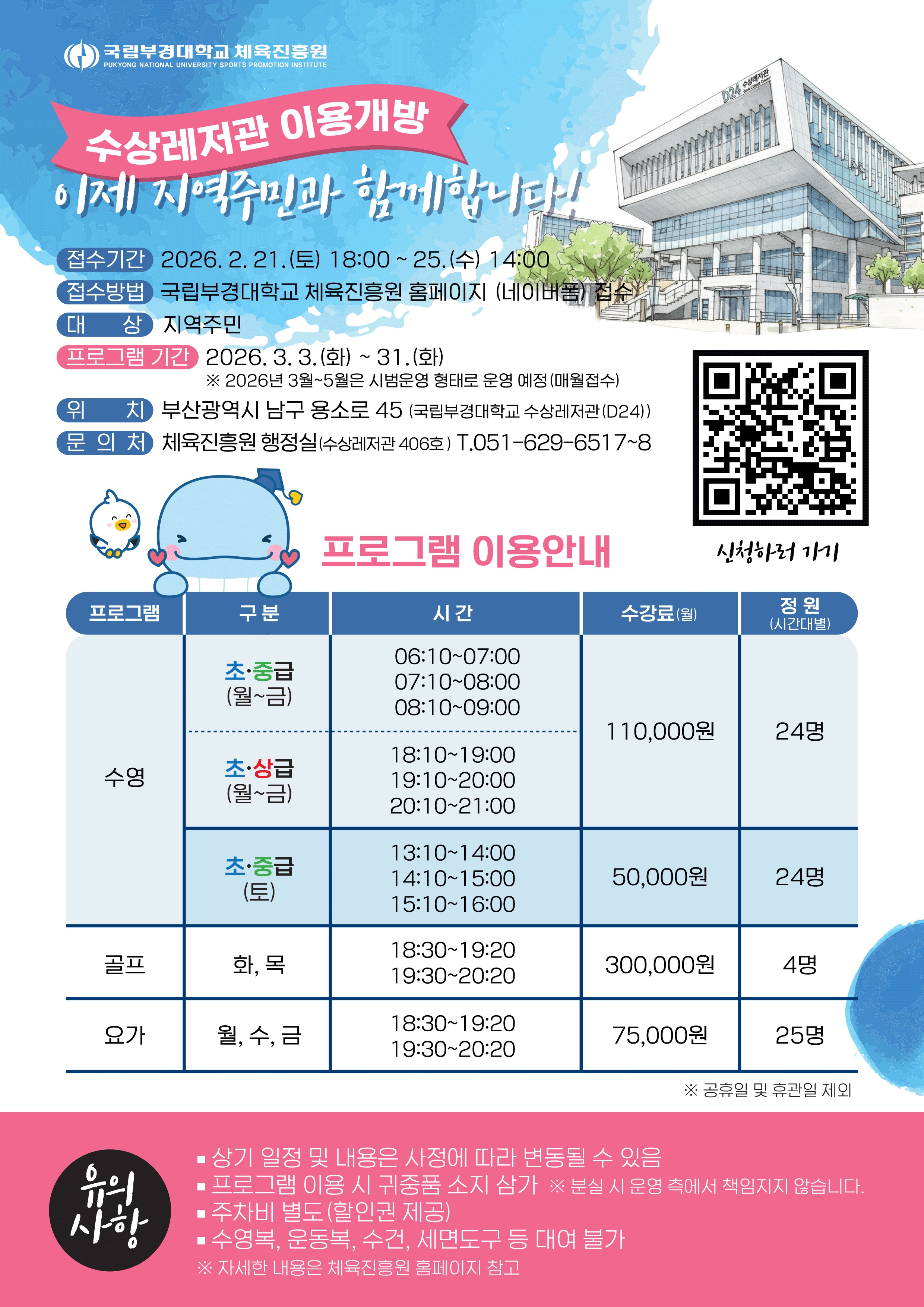 ■ 접수방법 - 접수기간: 2026. 2. 21.(토) 18:00 ~ 2026. 2. 25.(수) 14:00 - 신청서 작성(네이버폼 접수) ※2026. 2. 21. 18:00 오픈 예정 ○ 수영 초급 https://naver.me/x3cpCc95 ※ 해당 강좌는 정원 마감에 따라 신청이 조기 종료되었습니다. ○ 수영 중급 https://naver.me/GowJXw1y ※ 평일 새벽반(06:00~09:00), 토요일(13:00~14:00, 15:00~16:00)은 정원 마감에 따라 신청이 조기 종료되었습니다. ○ 수영 상급 https://naver.me/Fc6HW6GK ※ 해당 강좌는 정원 마감에 따라 신청이 조기 종료되었습니다. ○ 골프 레슨 https://naver.me/58qg6qKo. ※ 해당 강좌는 정원 마감에 따라 신청이 조기 종료되었습니다. ○ 요가 https://naver.me/GM37L3uZ - 선착순 접수 방식 운영 - 선착순 접수자에 한해 2026. 2. 25.(수) 14시 이 후 개별 문자(결제 및 입장방법 등) 발송 예정 - 입금 확인 후 최종 등록 완료 ※ 기존회원(학내 구성원) 신청 후 지역주민 접수 예정 ■ 유의사항 - 기한 내 미입금 시 자동 접수 취소 - 타인 명의 입금 시 사전 연락 필수 - 만 19세 이상 성인만 신청 가능 ■ 입장방법 - 최종 등록 완료자에 한해서 개별 문자 안내 ■ 문의 - 국립부경대학교 체육진흥원 행정실 ☎051-629-6517~8 ■ 기타사항[필독: 반드시 클릭하여 이용수칙 및 주차 장소를 확인] - 회원 이용 수칙: https://sports.pknu.ac.kr/sports/5069?action=view&no=9983661 - 주차장 안내: https://sports.pknu.ac.kr/sports/5069?action=view&no=9983667 |