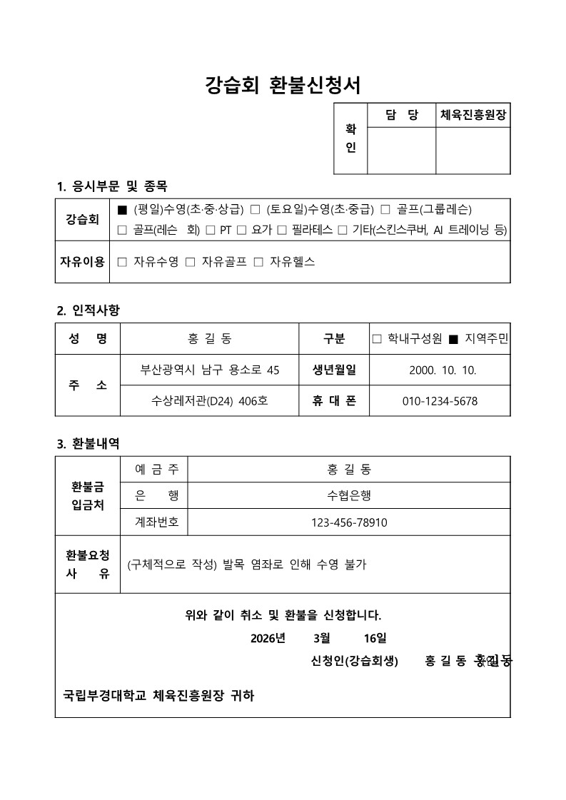 1. 첨부파일(수상레저관 강습회 환불신청서) 다운로드 2. 신청한 프로그램 체크 3. 인적 사항 작성 4. 환불금 입금처 작성 5. 환불사유 구체적으로 작성 6. 환불신청일자 작성, 서명 후 제출 7. 제출방법(메일): jhjgold@pknu.ac.kr ※ 환불 신청서를 제출한 날짜 기준(작성 일자x)으로 환불 금액 지급